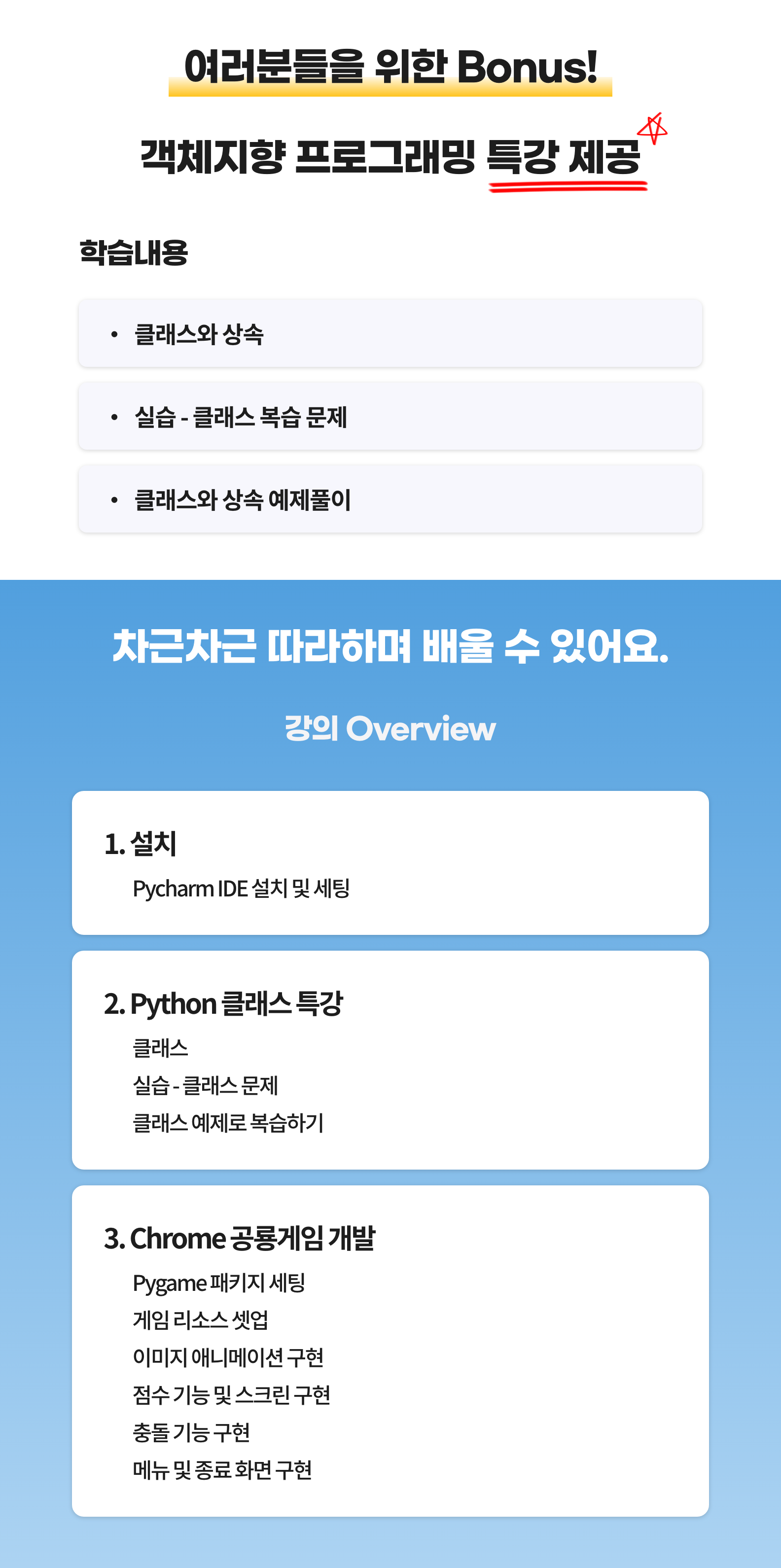 [학습목표]무엇을 배울 수 있나요? - 간단한 게임 개발 전과정 - Pycharm 개발 환경 설치 및 사용 - Python 객체지향 프로그래밍(클래스와 상속) - 게임 캐릭터 배치 및 애니메이션 구현 - 캐릭터와 장애물 간의 충돌 기능 - 게임종료 화면 및 점수구현 기능 |