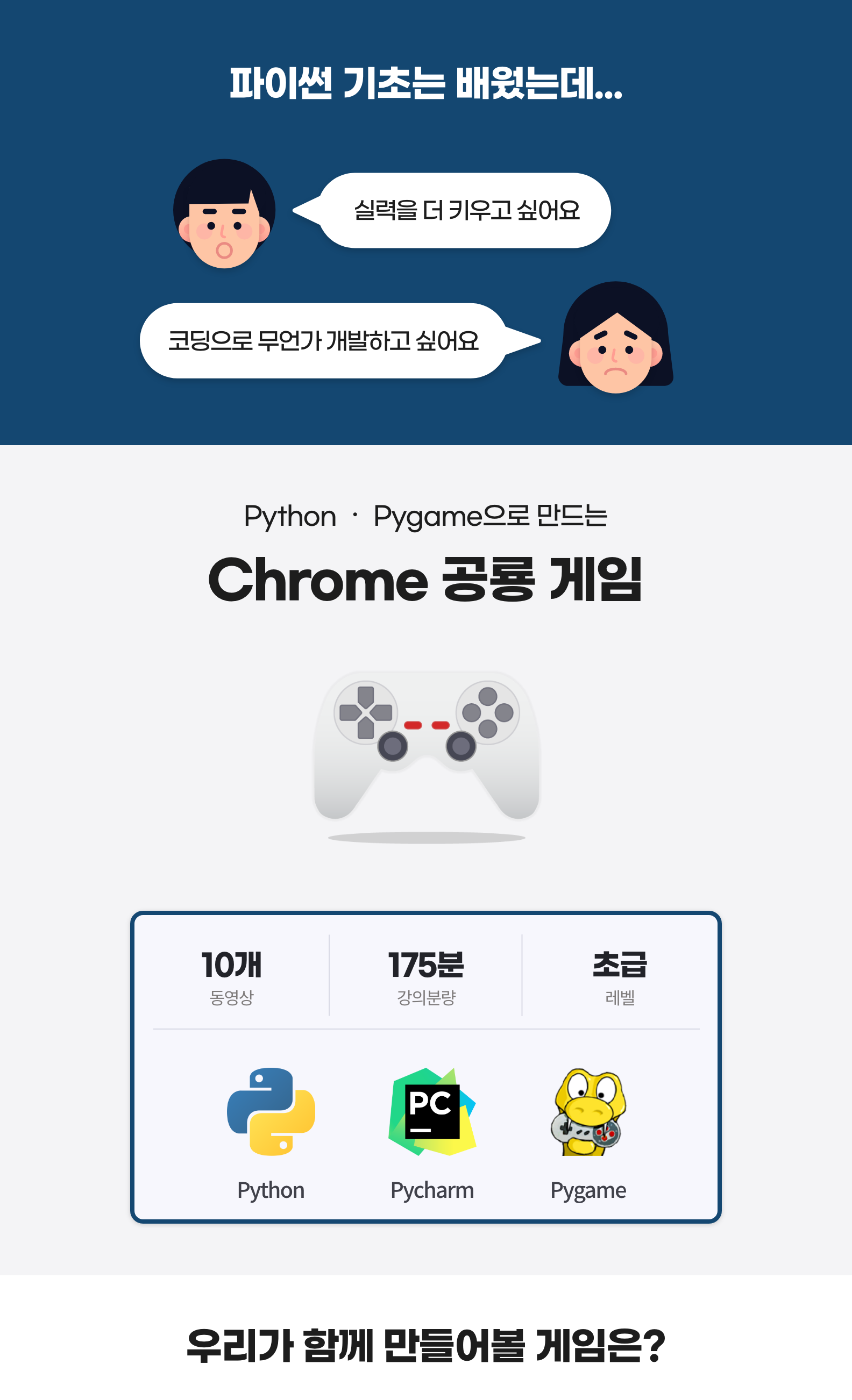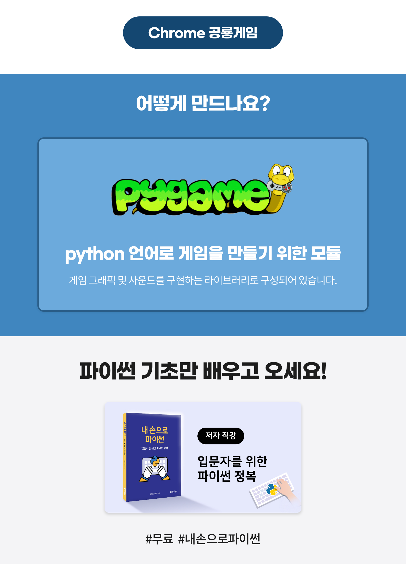 02. (Bonus) Python 클래스 03. (Bonus) Python 클래스 예제로 복습하기 04. 크롬 공룡게임 개발하기_패키지 세팅 및 프로젝트 소개 05. 크롬 공룡게임 개발하기_Setup 및 애니메이션 구현하기 06. 크롬 공룡게임 개발하기_캐릭터 동작 구현하기 07. 크롬 공룡게임 개발하기_점수 기능 및 스크린 구현하기 08. 크롬 공룡게임 개발하기_장애물 및 충돌 기능 구현하기 09. 크롬 공룡게임 개발하기_메뉴 및 게임종료화면 구현하기 |