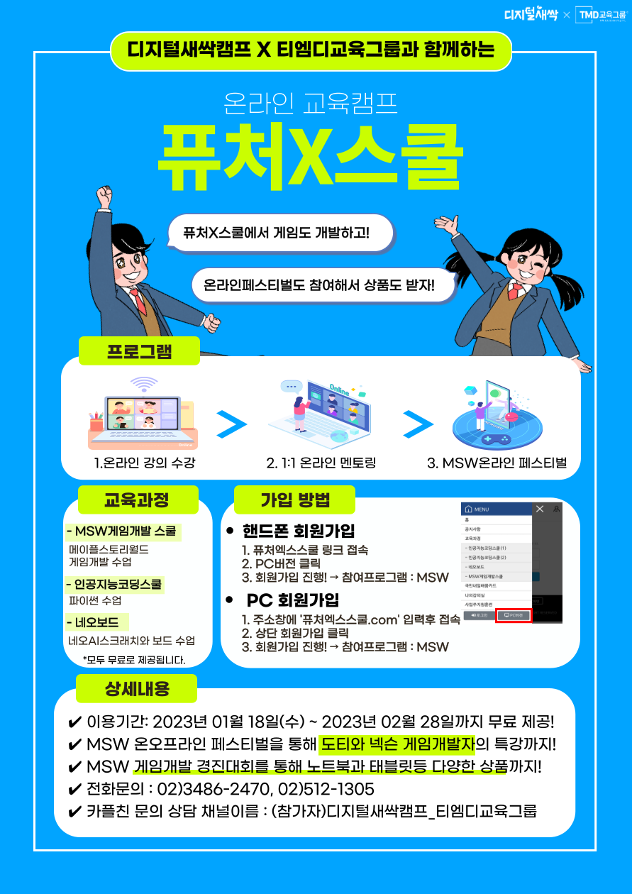 저희 퓨처엑스스쿨 프로그램 하이라이트!! MSW 경진대회와 온라인 페스티벌(02.27)을 개최합니다~! 참여하여 푸짐한 상품까지 받아가세요! 자세한 설명은 MSW 온오프라인 페스티벌 및 경진대회 공지사항을 참고해주세요!
