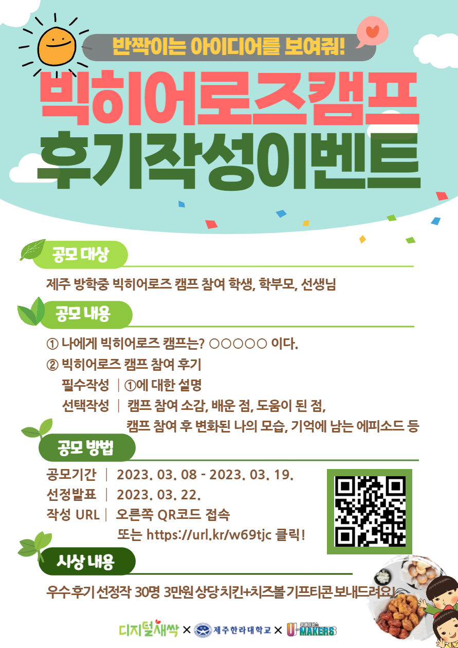 반짝반짝 빛나는 아이디어를 보여줘! 캠프참여 후기를 작성해준 우수 후기 선정작 30명에게 3만원 상당의 치킨+치즈볼 기프티콘을 쏩니다!!!