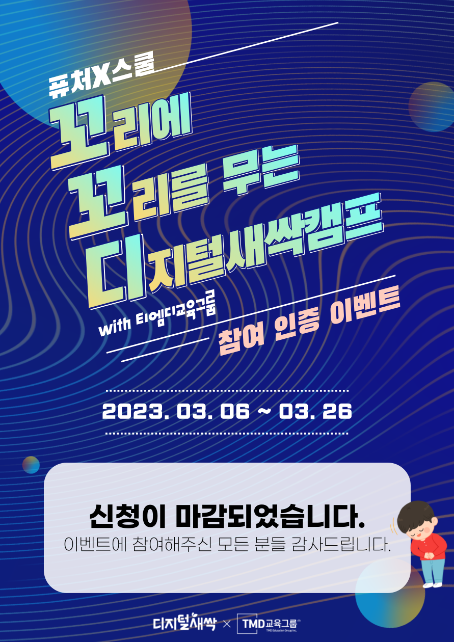 제목 | [디지털새싹X티엠디교육그룹] 퓨처엑스스쿨 참여 이벤트 마감 | ||